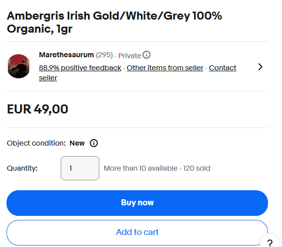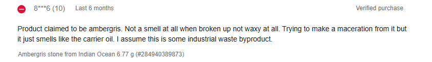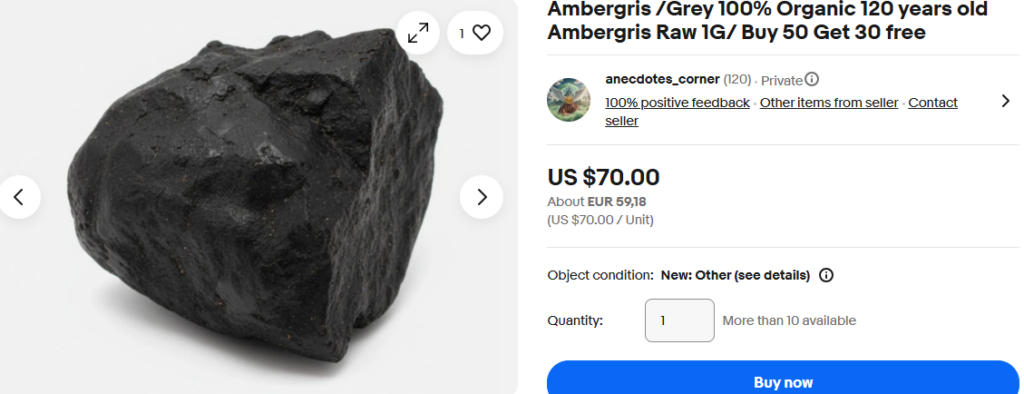 Anecdotes_corner tries to convince us the fake muck that they are using to try and defraud people with is ‘120 years old’, ’60 years old’ and ‘spiritual ambergris’. At $USD70.00 a gram it’s a genuine rip-off.