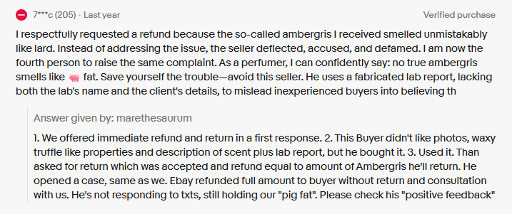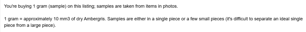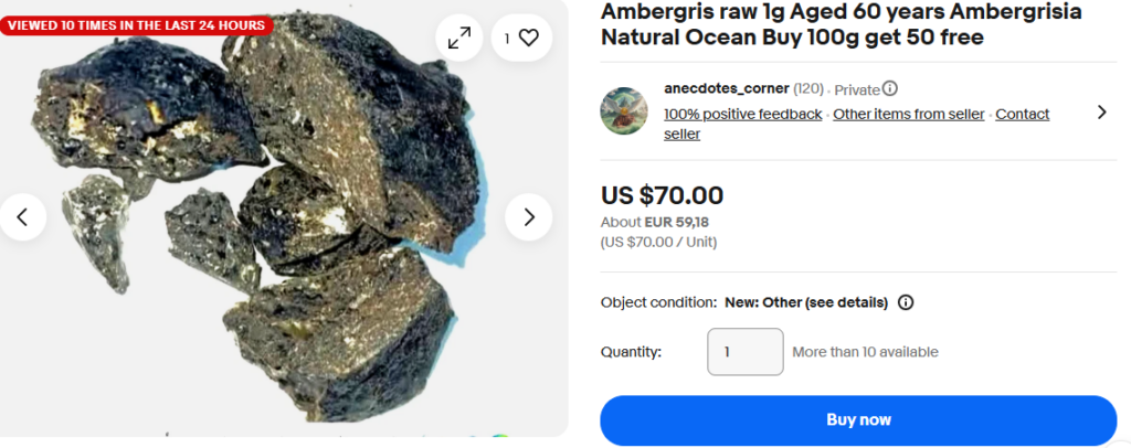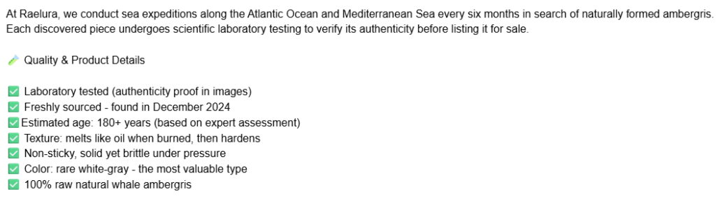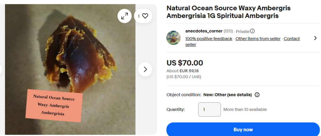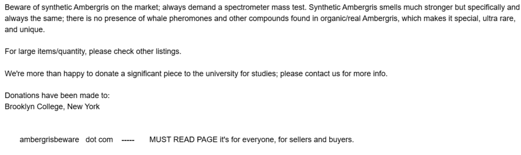 “Beware of synthetic Ambergris …”. Wise words but not from this scammer. This scammer has gone to the next level. They have referred to AMBERGRISBEWARE. This is a tactic that has been employed before. The scammers believe that because they refer to AmbergrisBeware potential customers will think they are verified or authenticated by us. They are not. AmbergrisBeware does not promote any ambergris vendors. To the knowledge of AmbergrisBeware there is only one genuine vendor of authentic ambergris in the world. You won’t find them on Ebay or Etsy or any other sales platform. You won’t find them on Instagram, X, Twitter, Tic Toc or other social media sites. They do have a webpage, and you won’t find them at the top rank of your search engine either because they don’t buy it from Google. The only way they can be identified is by their imagery of genuine ambergris and a realistic pricing structure.
