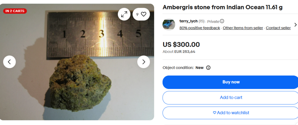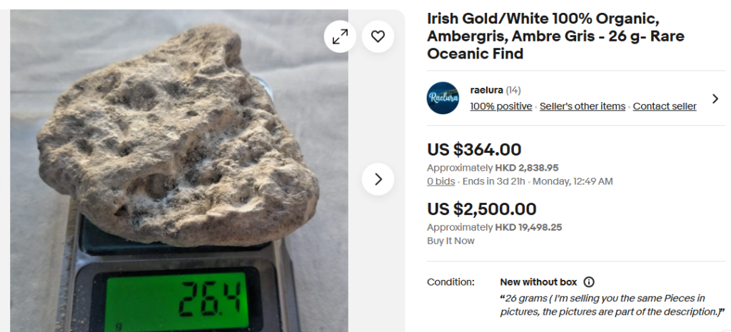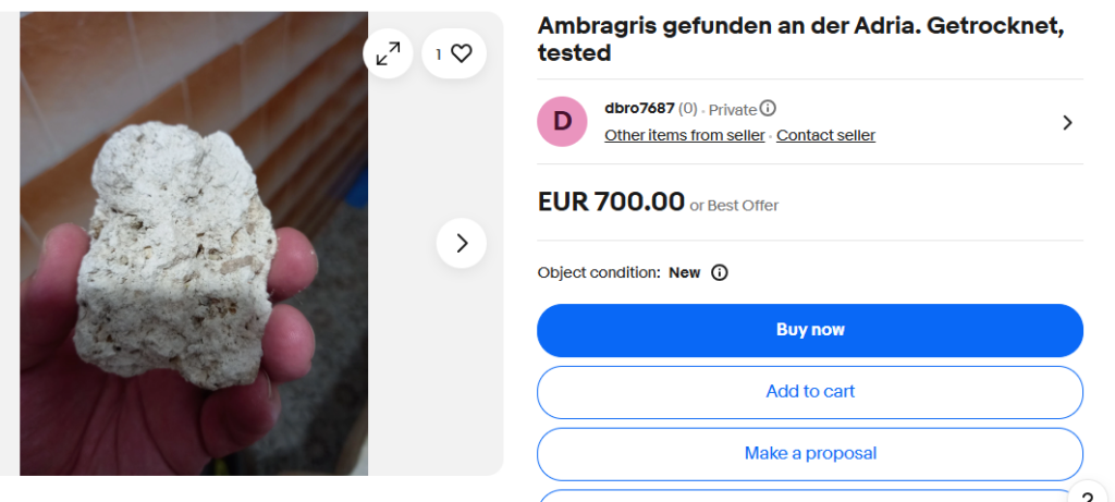 This dodgy offering by dbro7687 is from Italy (or so they say). The lump of something that’s almost certainly not ambergris is said to weigh 30 grams. So, EUR 23 is not the most expensive but is beyond what any sensible buyer would consider paying for authentic ambergris. Dbro7687 has a couple more lumps of over-priced stuff but as yet has no feedback, which is some good news because it suggests they are not part of a scam network. All the same, avoid.