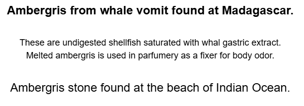 Terry-lych is not going to sell you ambergris. Instead, you will get, “undigested shellfish saturated with whal gastric extract”. Whatever that is. According to Terry it will fix your body odor. Terry also tells us it’s a “Ambergris stone”. It well could be stone. Some feedback for terry-lych: