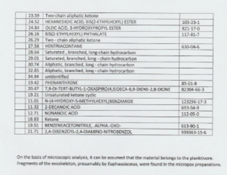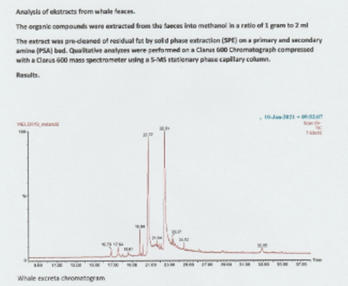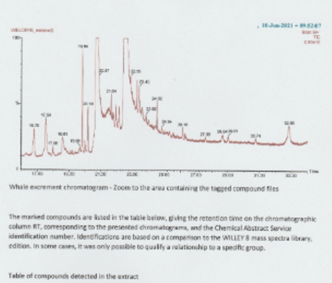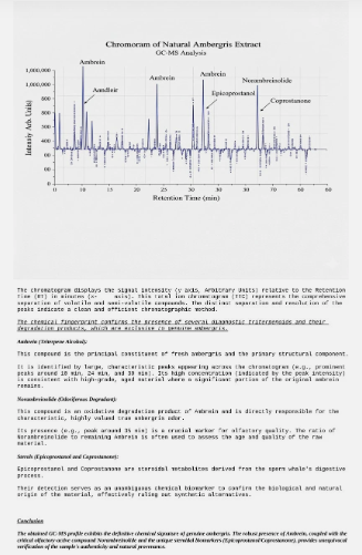 The second is that none of the compounds extracted relate whatsoever to ambergris. The primary compounds in genuine ambergris are, ambrein, epicoprostanol and coprostanone, amongst others. None of these are present in the alleged analysis report.