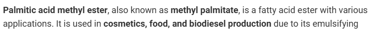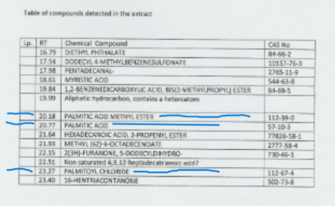 Palmitic acid is present in ambergris but also in Palm Oil. However, the most concerning is the presence of Palmatoyl Choride, a toxin.